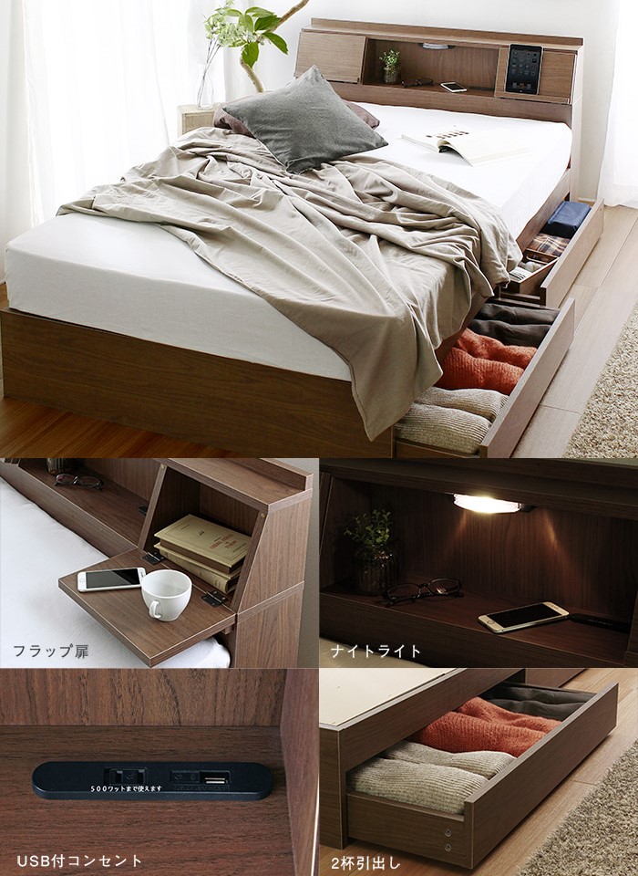 引出しの付いたベッド下収納や、開けるとテーブルとしても利用できるフラップ扉、USB付コンセント等、「便利」を詰め込んだベッドフレーム。