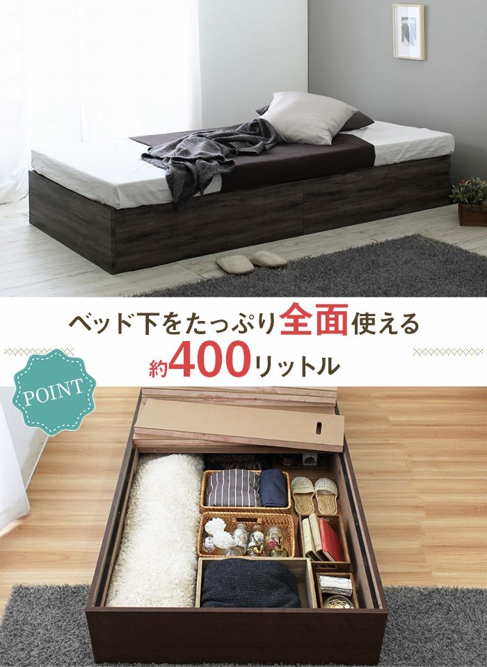 ベッド下部分の大半が収納スペースとなっており、季節物などの収納にぴったり。